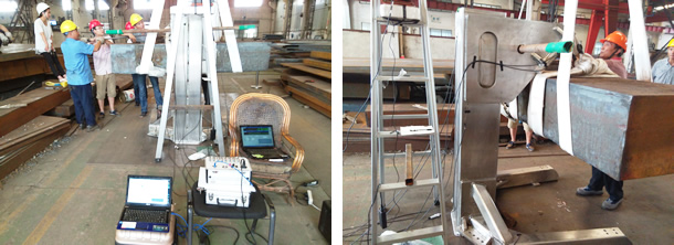 在机器人外架预设部位安装应变片和位移传感器,在工作状态下,记录应变值和位移值