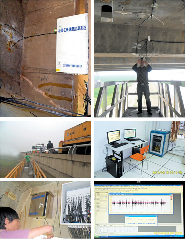 新沂河大桥位于京沪高速(G2)沐阳境内,京沪高速车流量较大,特别是重型货车,因此桥梁的各部位的健康状态需要实时监控。此次监控关注桥梁右幅第九联和第十一联的跨中和边跨位置。公司于2011年底开始着手新沂河大桥健康监控系统的设计工作,2012年年初开始进行现场传感器的布置、走线以及设备调试等。