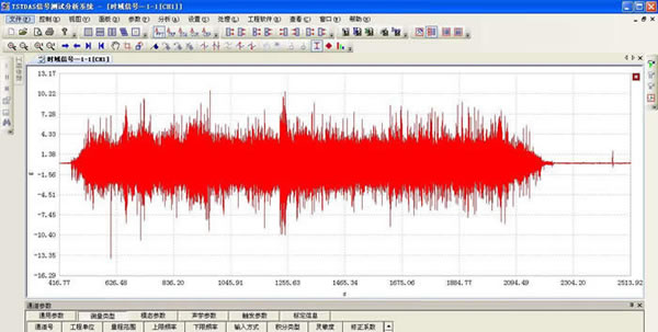 测试完成后配合各通道的传感器输入灵敏度设置,即可得到加速度变化的实时曲线。可进行后续的频谱分析、传函、幅值、相关、倒谱分析等等。