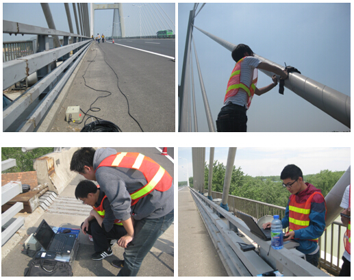 淮安大桥为宿淮盐高速公路上的一座特大型全悬浮式斜拉索桥梁,主桥长度580m,共有拉索256根。此次实验主要是对全桥的索力和模态参数进行测量,以便对桥梁的结构安全性进行评估。我公司配合东南大学完成了此次实验。