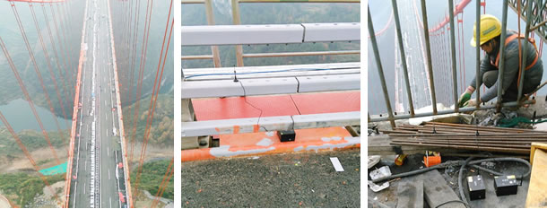 通过分批布置无线振动测量系统,获取环境激励下各个测点振动,进行模态分析,得到基频、阻尼和振型;80辆40T载荷车辆四级动静载加载下中载、偏载对应扰度、应变及最大索力测试