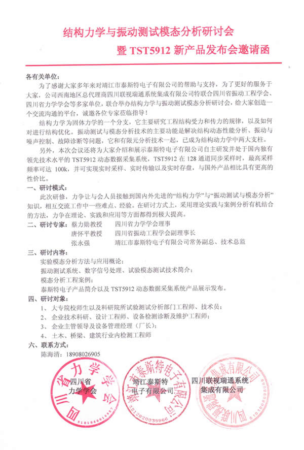 | 为了感谢大家多年来对江苏泰之特物联科技股份有限公司帮助与支持,为了更好的服务于大家,公司西南地区总代理商四川联视瑞通系统集成有限公司特联合四川省振动工程学会、四川省力学学会等多家单位,联合举办结构力学与振动测试模态分析研讨会,给大家创造一个交流沟通的平台,诚邀各位专家莅临指导! |