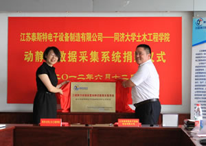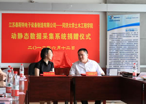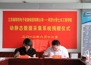 2012 年 6 月 12 日,我公司和同济大学 土木工程学院在同济大学签定共建创新实验室的协议,并捐赠了一批价值二十余万的动、静态应变、振动信号测试设备和软件。标志着双方为培养创新型人才,振兴民族电子设备制造工业,走“产、学、研”联合发展道路迈出了重要的一步。