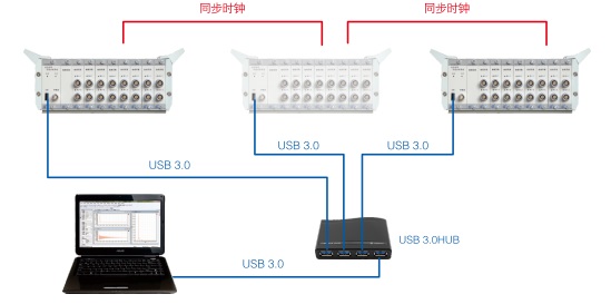 数据采集系统与计算机通过USB3.0/千兆网通讯,通过网络技术,可实现无限多通道扩展并行采样,实时进行信号采集、储存、显示和分析等。